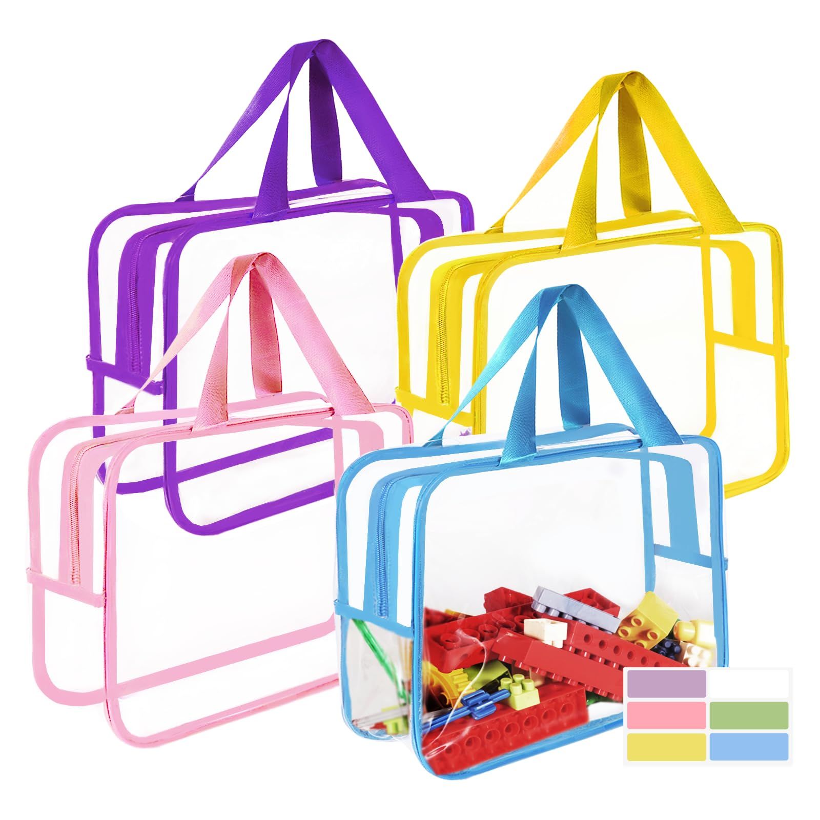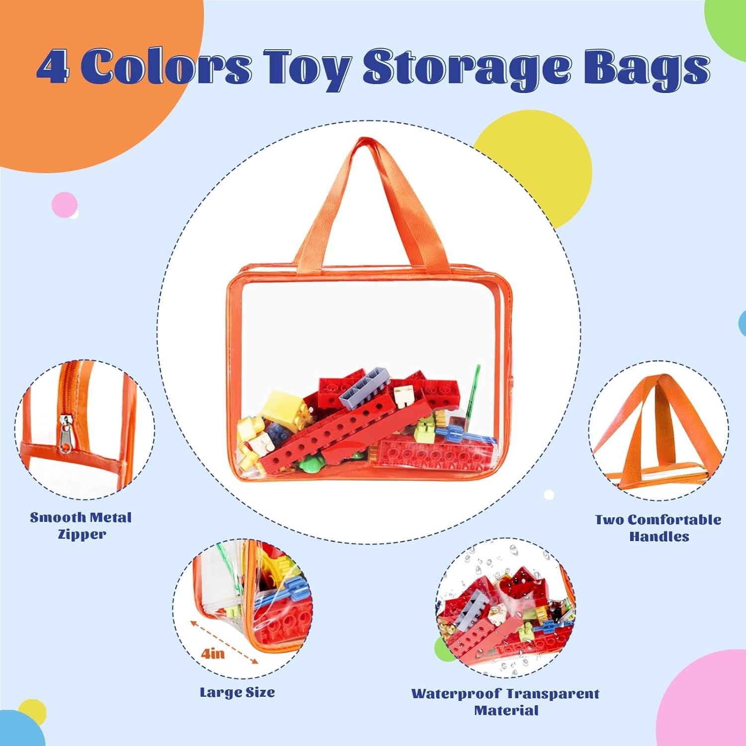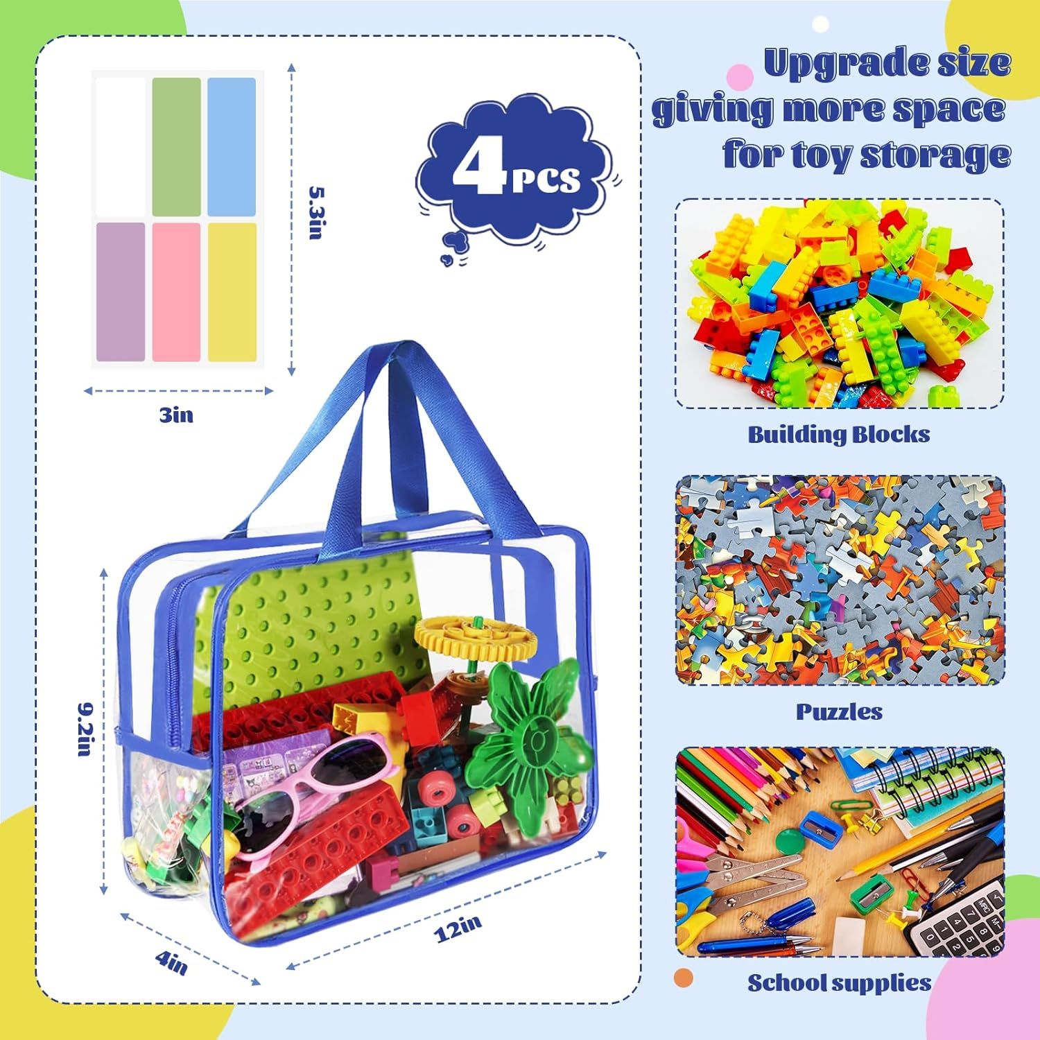 4 Pcs Toy Storage Bags, Clear PVC Toy Organizer with Zipper, Waterproof Travel Bags with Labels for Building Blocks, Puzzle, Kids Books (multicolor2)