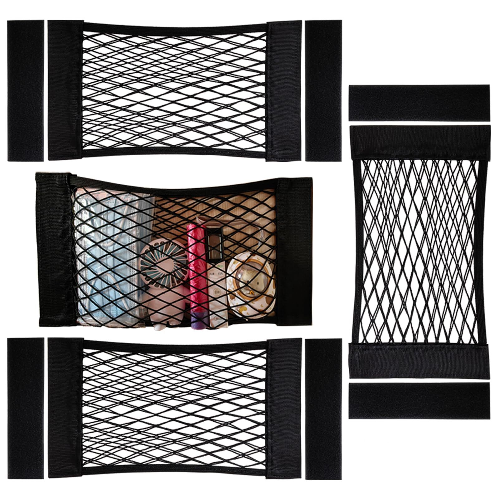 4Pack Automotive Cargo Net Car Storage Wall Sticker Organizer Pouch Bag Elastic Mesh Pocket with Tape Stickers for Trunk Organizer Holder for Cabinet Organize 4PCS (Same Size)