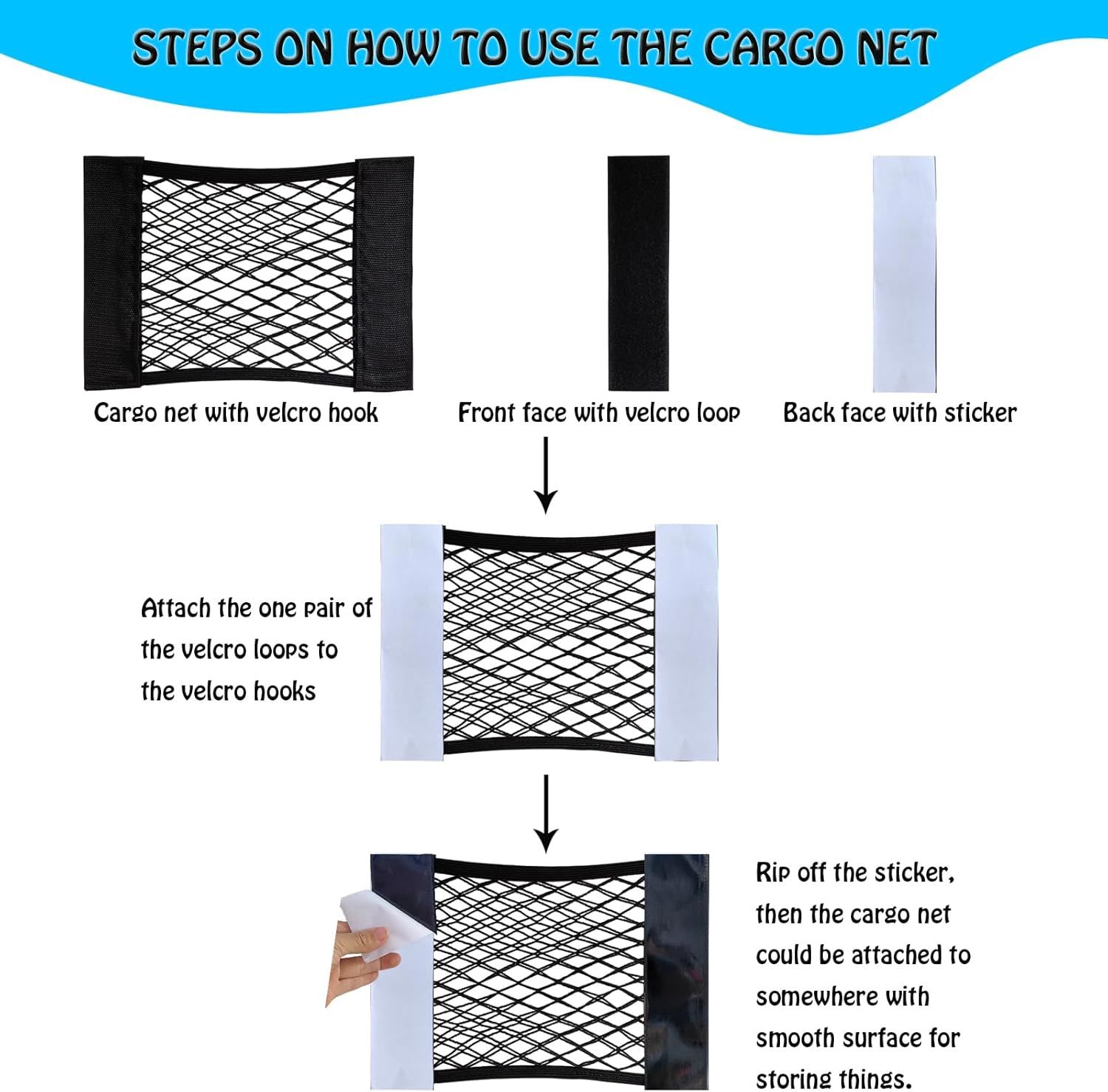 Rip off the sticker, then cargo net could be attached to somewhere with smooth surface for storage