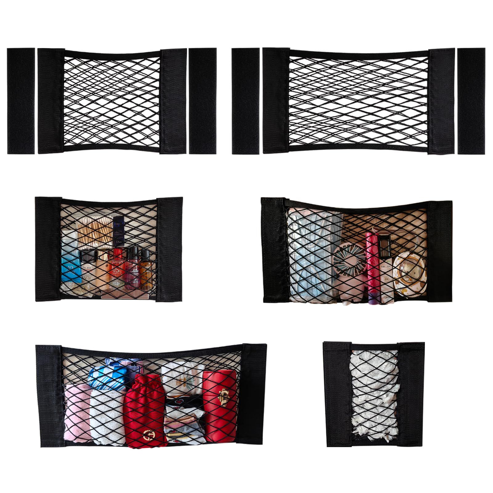 Cargo nets can be attached to car, refrigerator, all kinds of cabinets, for storing all kinds of small things, like socks, towels,underpants,masks,garbage bags,plastic wrap etc.
