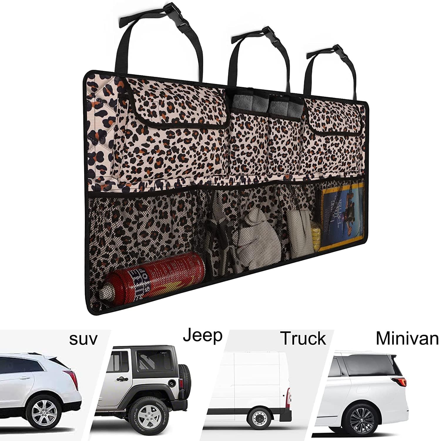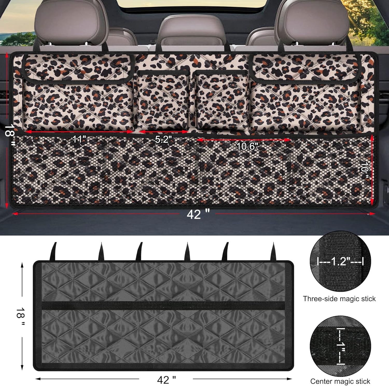 Femuar Car Trunk Organizer,Large Capacity Backseat Trunk Organizer(42"*18"),Collapsible Car Storage Bag with 8 Pocekt,Car Organizer for SUV/MPV/Truck - Leopard print