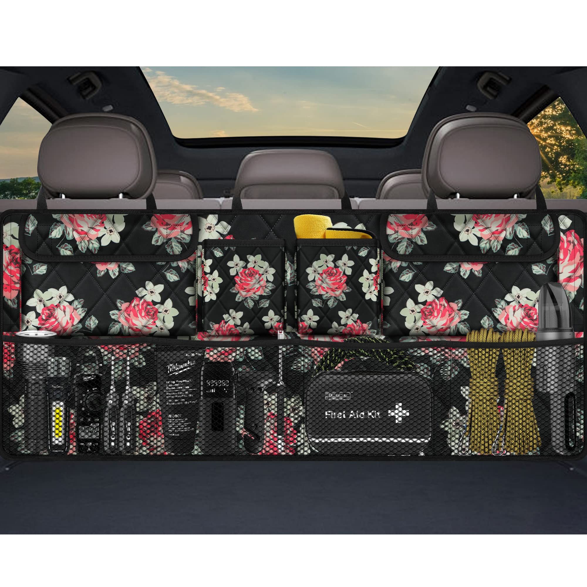 Ultra-large capacity car storage organizer design with mesh pocket to easy get the things that you need.