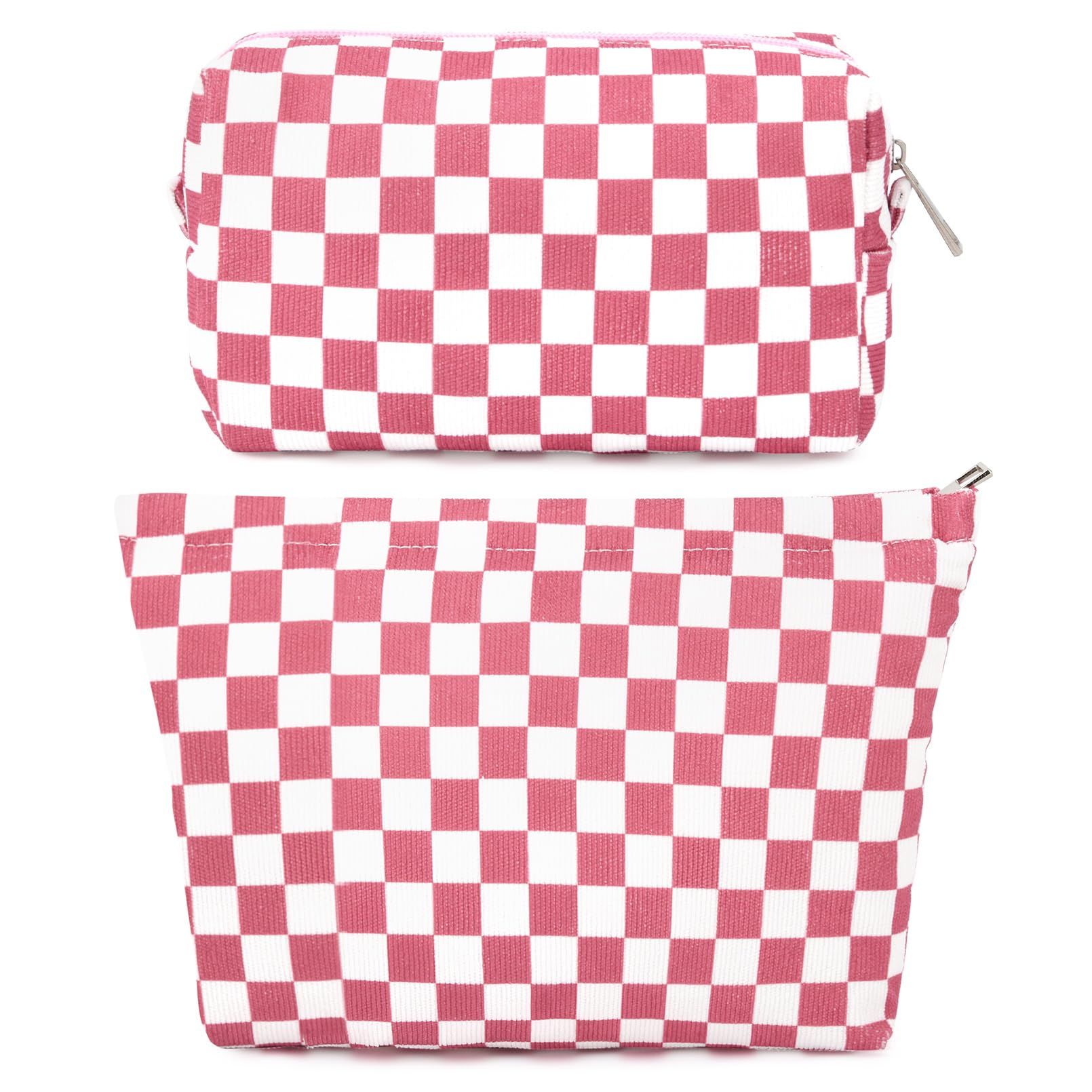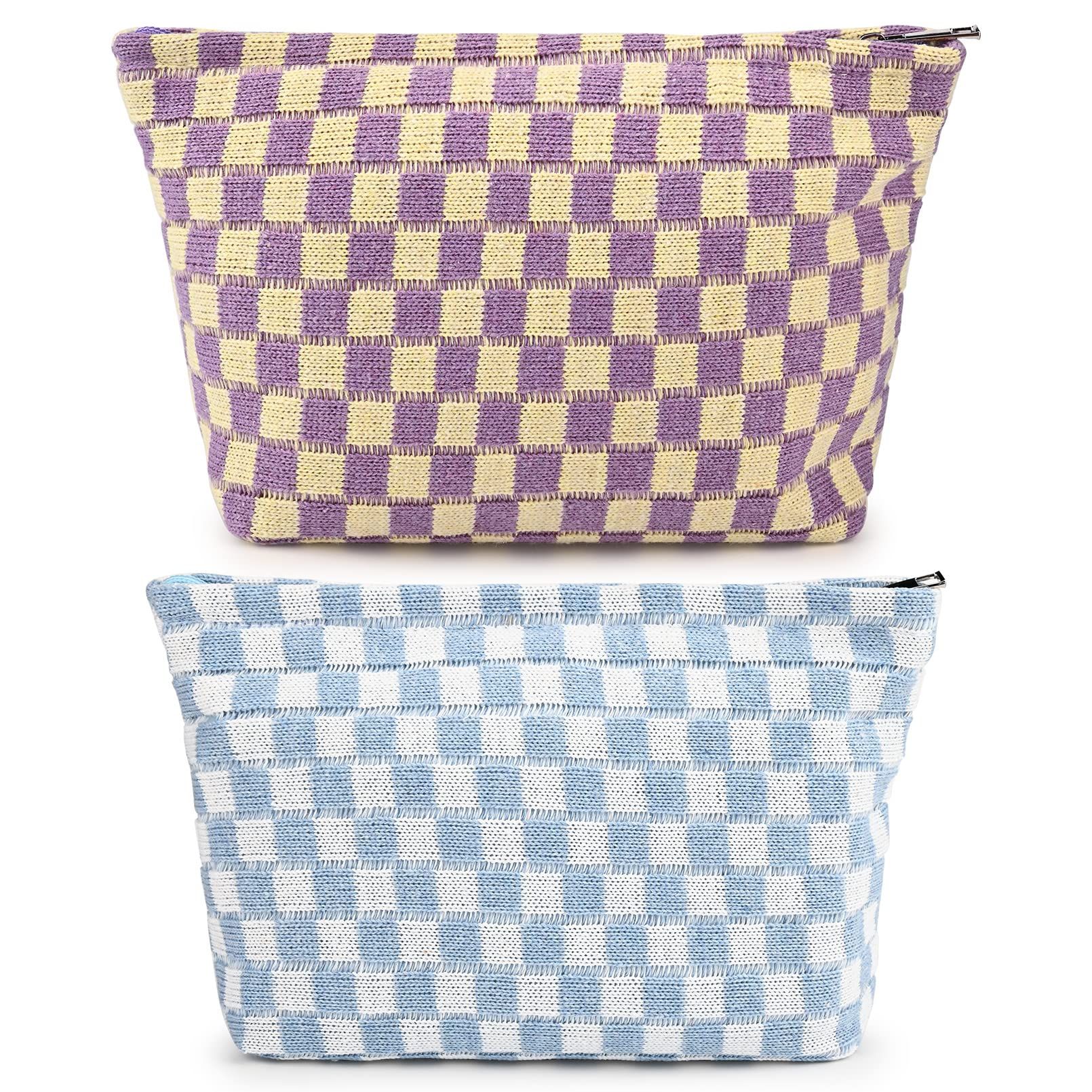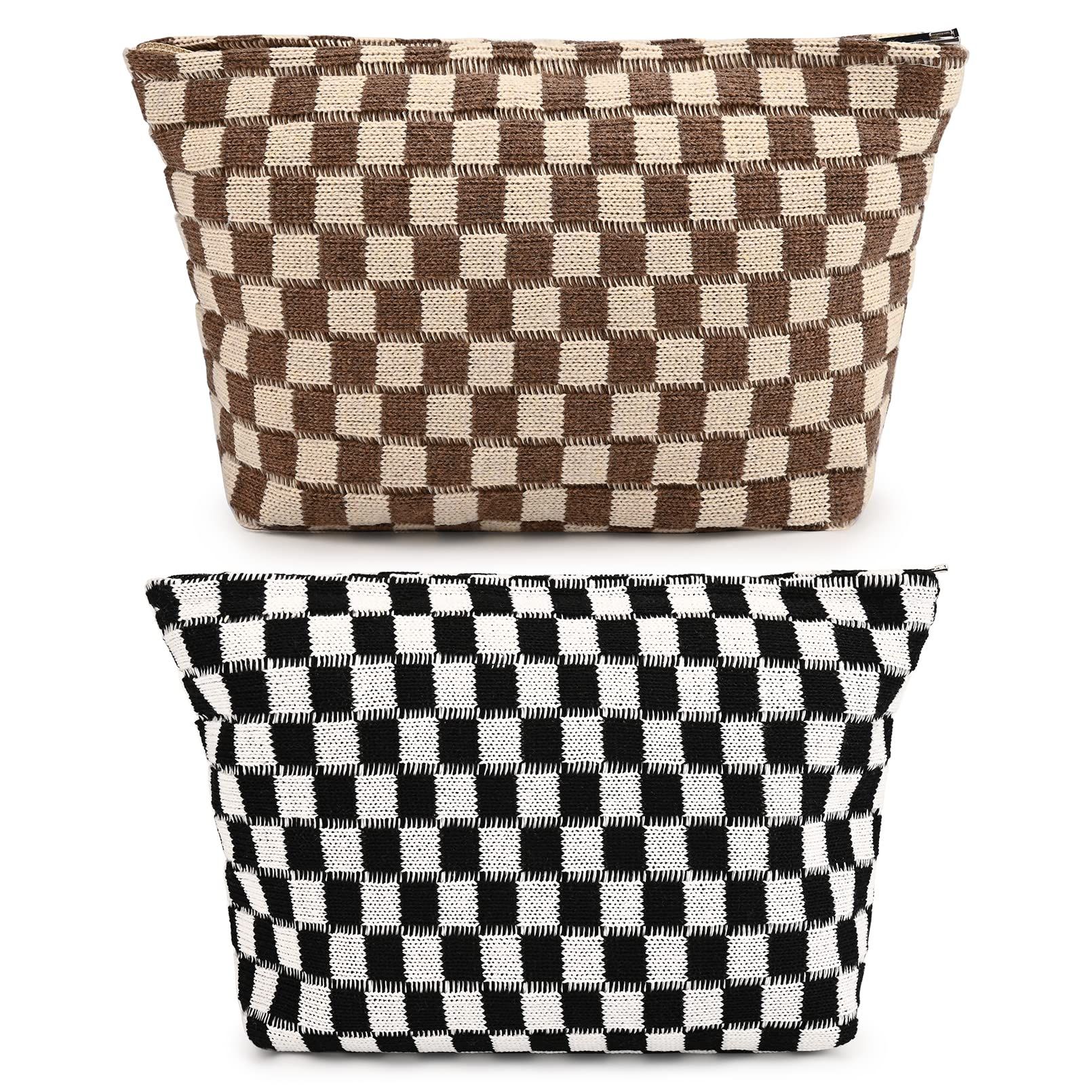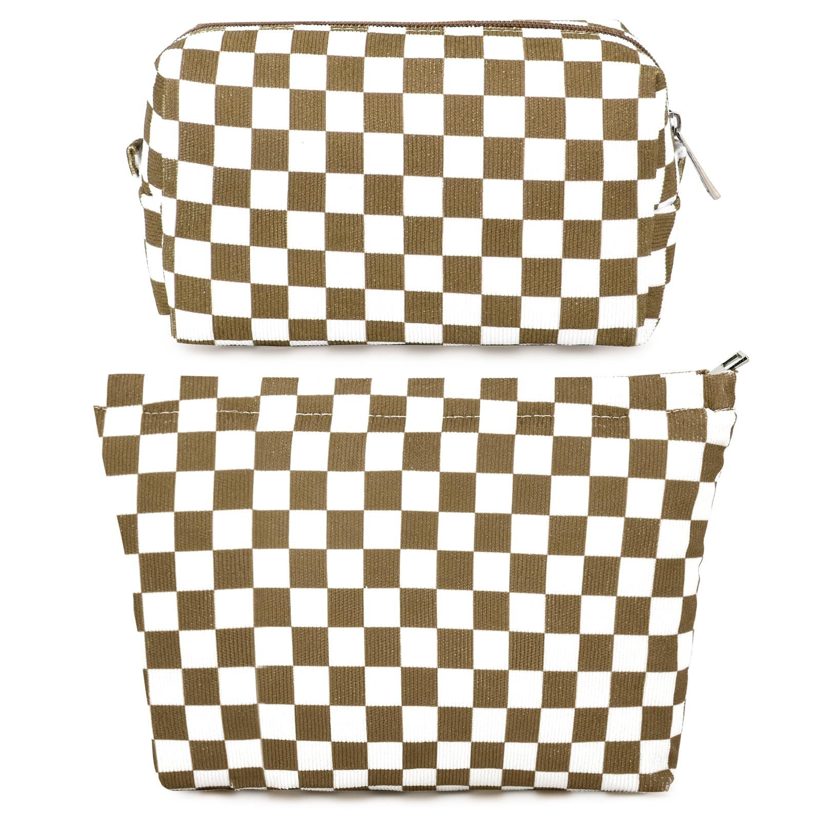 SOIDRAM 2 Pieces Makeup Bag Large Checkered Cosmetic Bag Capacity Canvas Mix Travel Toiletry Bag Organizer Cute Makeup Brushes Aesthetic Accessories Storage Bag for Women, Checkered Mix Brown