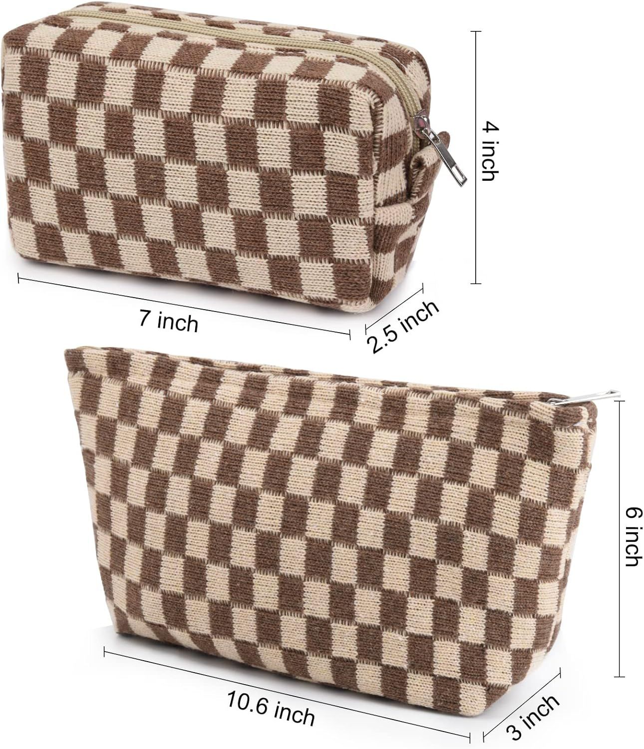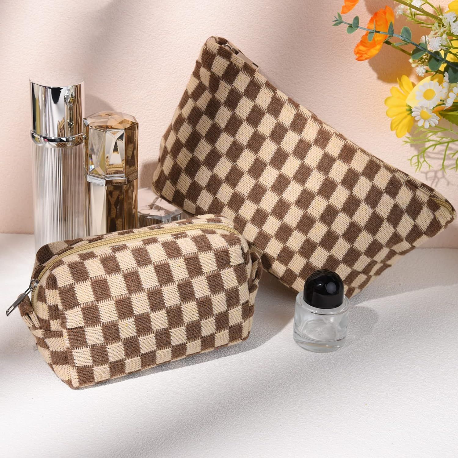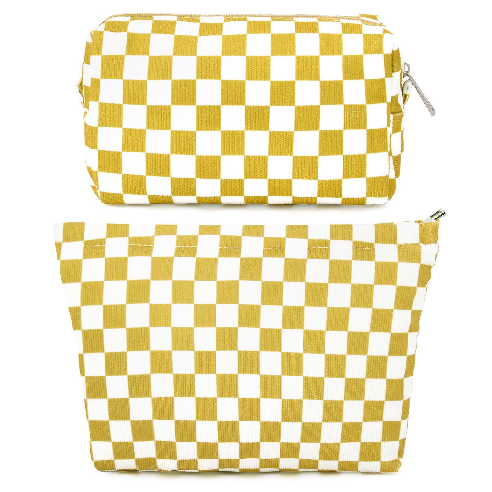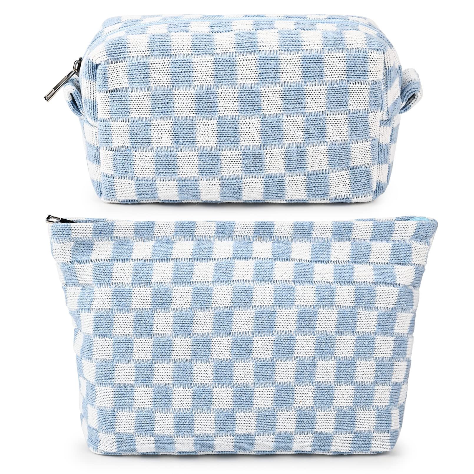SOIDRAM 2 Pieces Makeup Bag Large Checkered Cosmetic Bag Capacity Canvas Mix Travel Toiletry Bag Organizer Cute Makeup Brushes Aesthetic Accessories Storage Bag for Women, Checkered Mix Brown